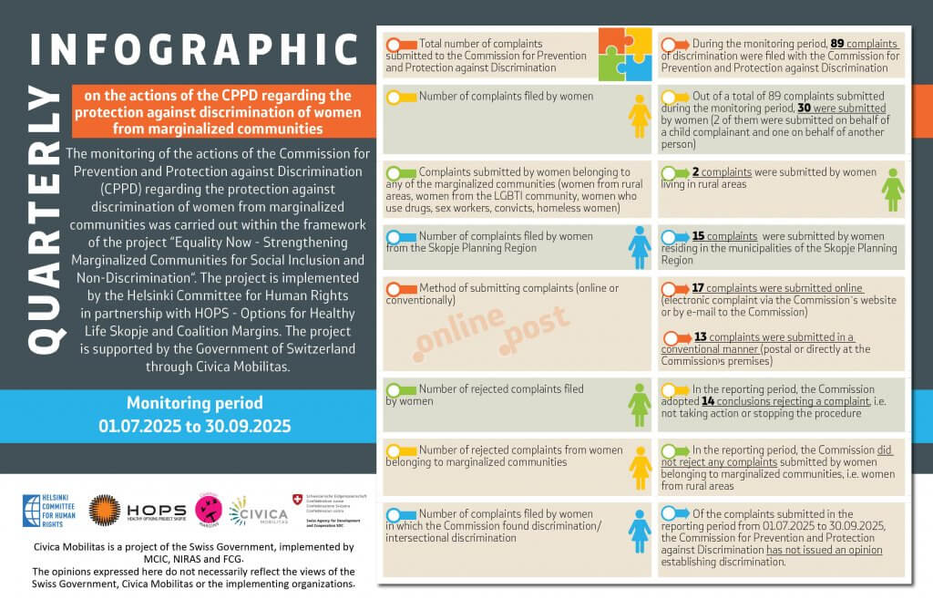 The monitoring of the actions of the KSZD for the protection of women from marginalized communities from discrimination was conducted by the Helsinki Committee for Human Rights within the framework of the project “Equality Now – Strengthening Marginalized Communities for Social Inclusion and Non-Discrimination“, financially supported by Switzerland through Civica Mobilitas, with grants for civic engagement implemented in partnership with HOPS-Options for Healthy Life Skopje and Coalition Margins.