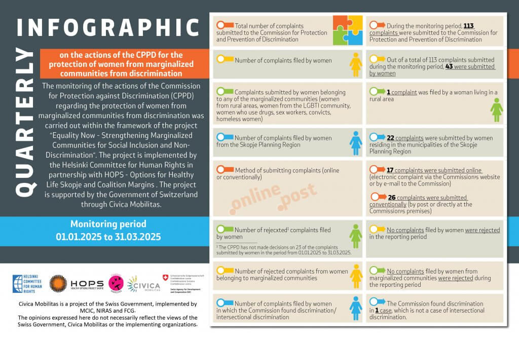 The monitoring of the actions of the KSZD for the protection of women from marginalized communities from discrimination was conducted by the Helsinki Committee for Human Rights within the framework of the project “Equality Now – Strengthening Marginalized Communities for Social Inclusion and Non-Discrimination“, financially supported by Switzerland through Civica Mobilitas, with grants for civic engagement implemented in partnership with HOPS-Options for Healthy Life Skopje and Coalition Margins.