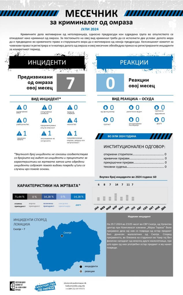 Хелсиншкиот комитет за човекови права ги регистрира и ги мапира делата од омраза и овој месечник обезбедува приказ на регистрираните инциденти за јули, 2024 година.