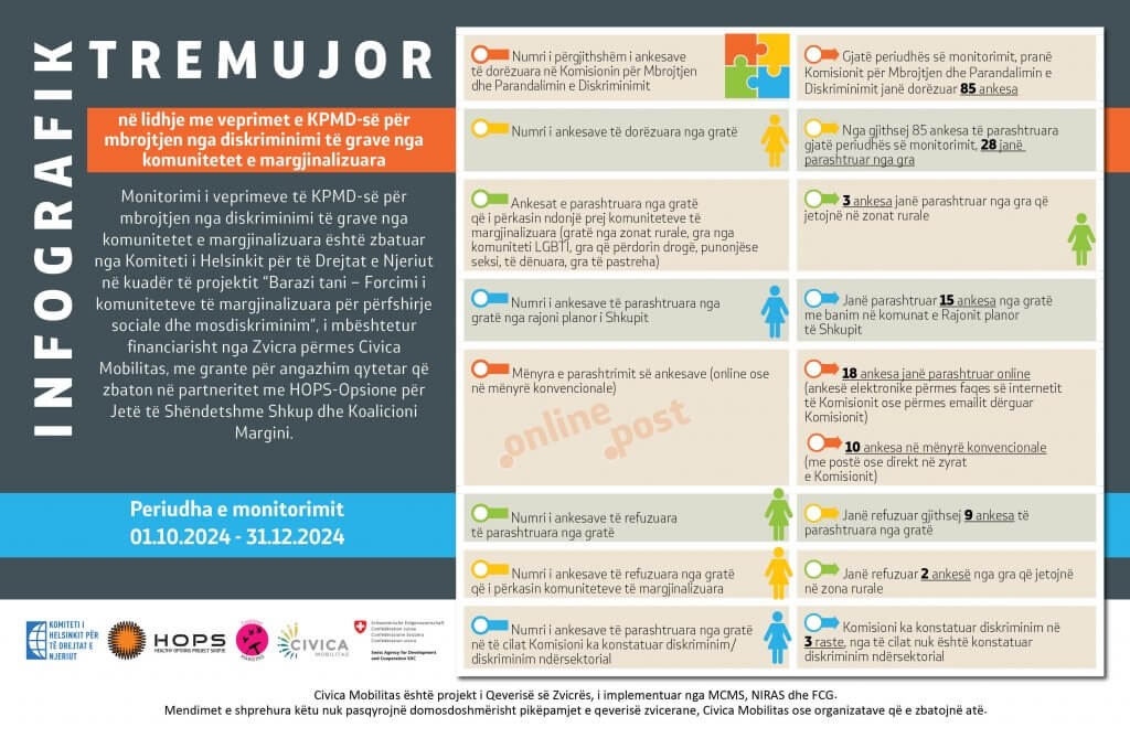 Infografik tremujor në lidhje me veprimet e KPMD-së për mbrojtjen nga diskriminimi të grave nga komunitetet e margjinalizuara