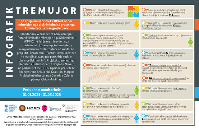 Lufta kundër torturës dhe trajtimit çnjerëzor – infografik për periudhën dhjetor 2021- maj 2022 August 9, 2022 Shpërndaje këtë postim Ndani me Facebook Ndani me X Ndani me LinkedIn Ndani me e-mail Publikuar së fundi në kategori Raporte të veçanta Infografik tremujor në lidhje me veprimet e KPMD-së për mbrojtjen nga diskriminimi të grave nga komunitetet e margjinalizuara, periudha e monitorimit 01.07.2025. – 30.09.2025 December 5, 2025 Situata e gjuhës së urrejtjes në gjysmën e parë të vitit 2025 September 26, 2025 Forcimi i kapaciteteve të oficerëve të policisë për të vepruar në rastet e gjuhës së urrejtjes September 26, 2025