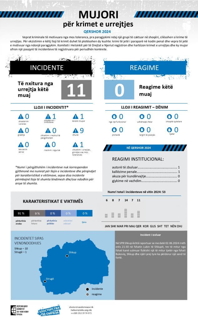 Komiteti i Helsinkit për të Drejtat e Njeriut regjistron dhe hartëzon krimet e urrejtjes dhe këtë muaj ofron një pasqyrë të incidenteve të regjistruara për Qershor 2024.