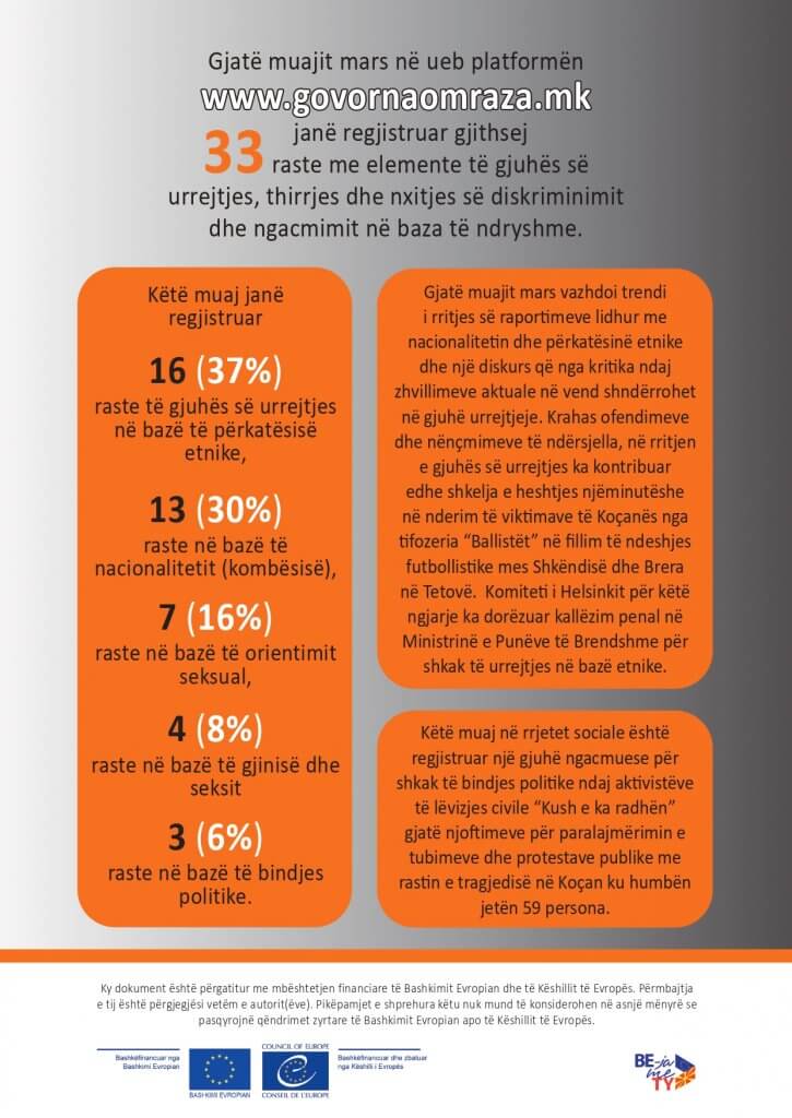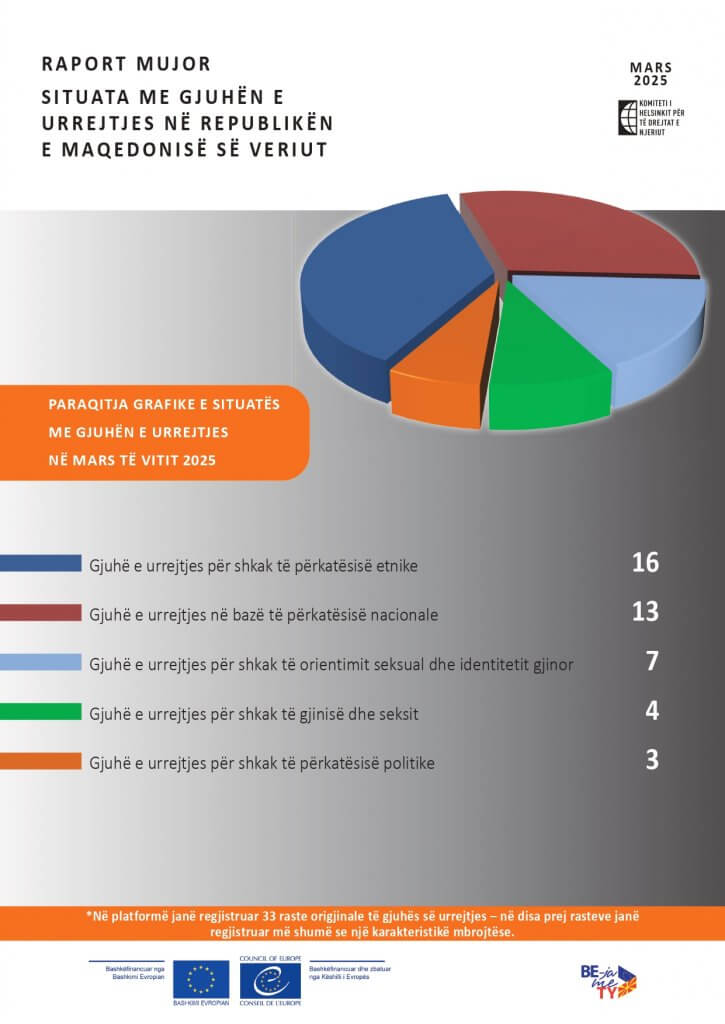 RAPORT MUJOR SITUATA ME GJUHËN E URREJTJES NË REPUBLIKËN E MAQEDONISË SË VERIUT – Mars, 2025 April 14, 2025 Dokumentet RAPORT MUJOR SITUATA ME GJUHËN E URREJTJES NË REPUBLIKËN E MAQEDONISË SË VERIUT – Mars, 2025 Shpërndaje këtë postim Ndani me Facebook Ndani me X Ndani me LinkedIn Ndani me e-mail Publikuar së fundi në kategori Raporte të veçanta Infografik tremujor në lidhje me veprimet e KPMD-së për mbrojtjen nga diskriminimi të grave nga komunitetet e margjinalizuara, periudha e monitorimit 01.07.2025. – 30.09.2025 December 5, 2025 Situata e gjuhës së urrejtjes në gjysmën e parë të vitit 2025 September 26, 2025 Forcimi i kapaciteteve të oficerëve të policisë për të vepruar në rastet e gjuhës së urrejtjes September 26, 2025