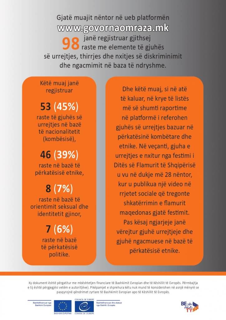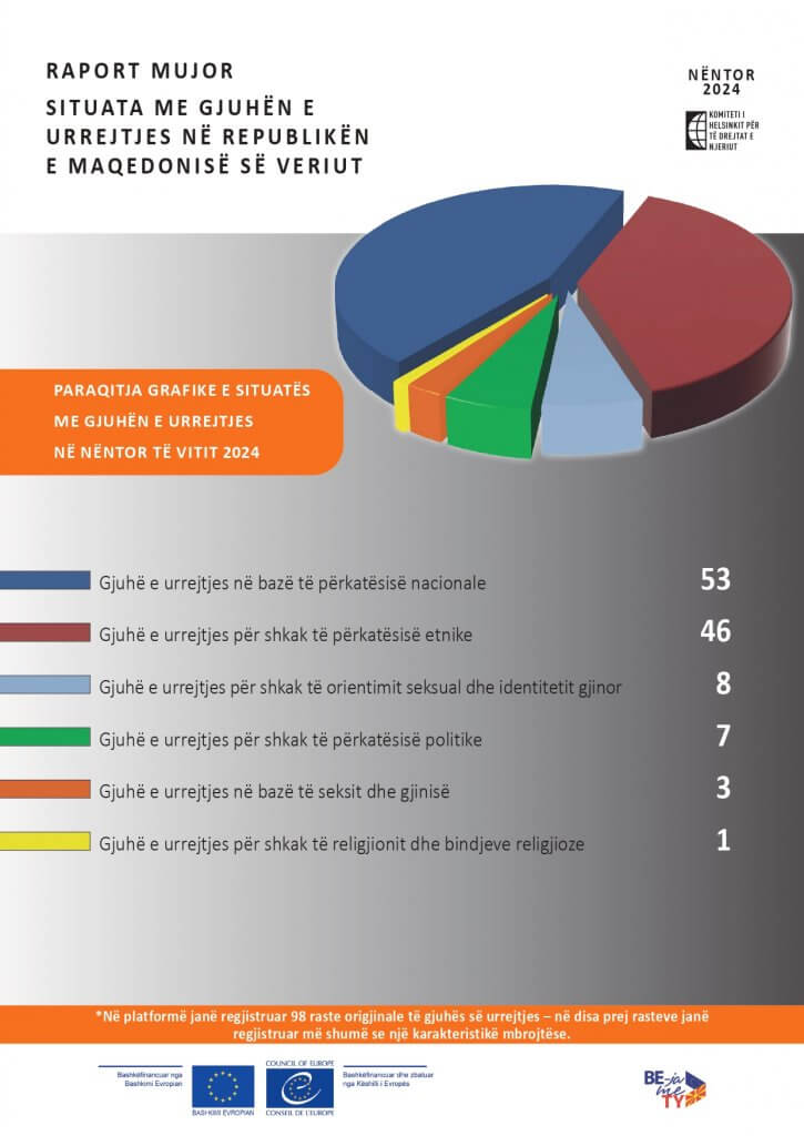 RAPORT MUJOR SITUATA ME GJUHËN E URREJTJES NË REPUBLIKËN E MAQEDONISË SË VERIUT – Nëntor, 2024 January 24, 2025 Dokumentet RAPORT MUJOR SITUATA ME GJUHËN E URREJTJES NË REPUBLIKËN E MAQEDONISË SË VERIUT – Nëntor, 2024 Shpërndaje këtë postim Ndani me Facebook Ndani me X Ndani me LinkedIn Ndani me e-mail Publikuar së fundi në kategori Raporte të veçanta Infografik tremujor në lidhje me veprimet e KPMD-së për mbrojtjen nga diskriminimi të grave nga komunitetet e margjinalizuara, periudha e monitorimit 01.07.2025. – 30.09.2025 December 5, 2025 Situata e gjuhës së urrejtjes në gjysmën e parë të vitit 2025 September 26, 2025 Forcimi i kapaciteteve të oficerëve të policisë për të vepruar në rastet e gjuhës së urrejtjes September 26, 2025